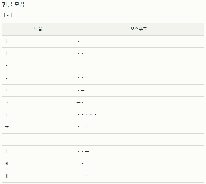 - 한글 자음과 모음 각각에 대응하는 모스부호가 지정되어 있습니다.