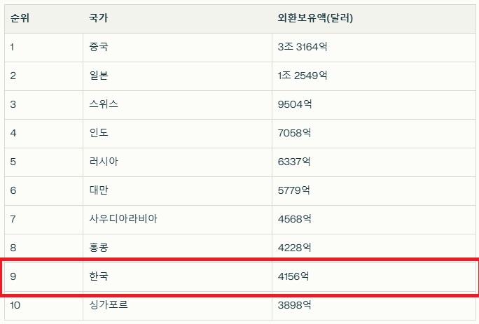 한국의 외환보유고는 2024년 현재 약 4,000억 달러를 넘어섰습니다. 이는 한국 경제의 안정성을 반영하며, 대외적인 신뢰를 쌓는 중요한 지표로 평가됩니다. 외환보유고 순위는 9위로 전 세계적으로도 상위권에 속하며, 한국은 대외 경제 위기 시 충분한 자금을 확보하고 있습니다.