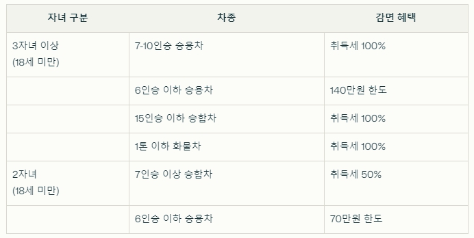 2025년부터 다자녀 가구의 기준이 3자녀에서 2자녀로 완화되어, 2자녀 가구도 자동차 취득세 감면 혜택을 받을 수 있게 됩니다.